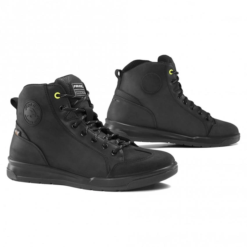 The Falco Pyro is a motorcycle sneaker made of matte black leather combined with ventilated Mycro-synth. The High-tex membrane keeps your feet dry in light to moderate rain, ideal for those unexpected rain showers. The Pyro is reinforced around the toe and heel area and the ankle is reinforced with a D3O ankle cup. Furthermore, the dual compound rubber sole offers sufficient grip.